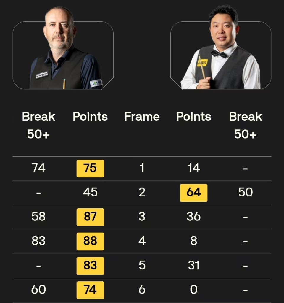 在本场比赛中,马克威廉姆斯延续了此前的不俗状态。前世界冠军凭借单杆打出74分、58分、83分、60分的表现连胜四局以5-1击败张安达挺进四强。